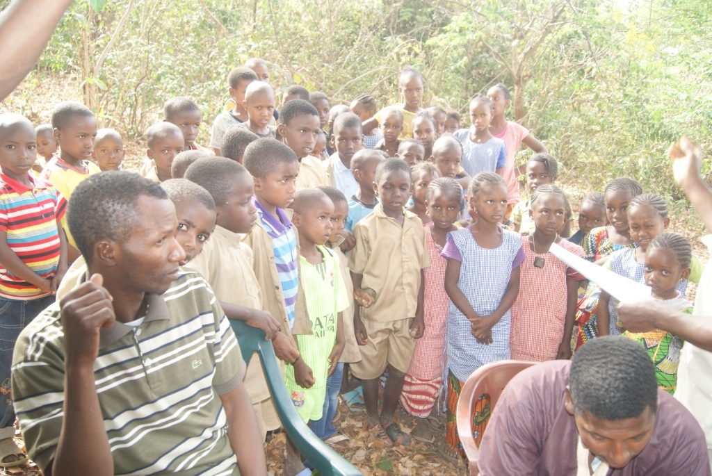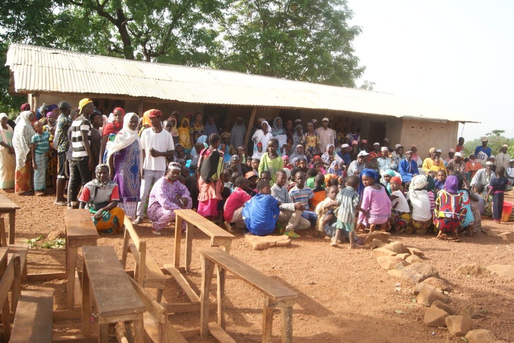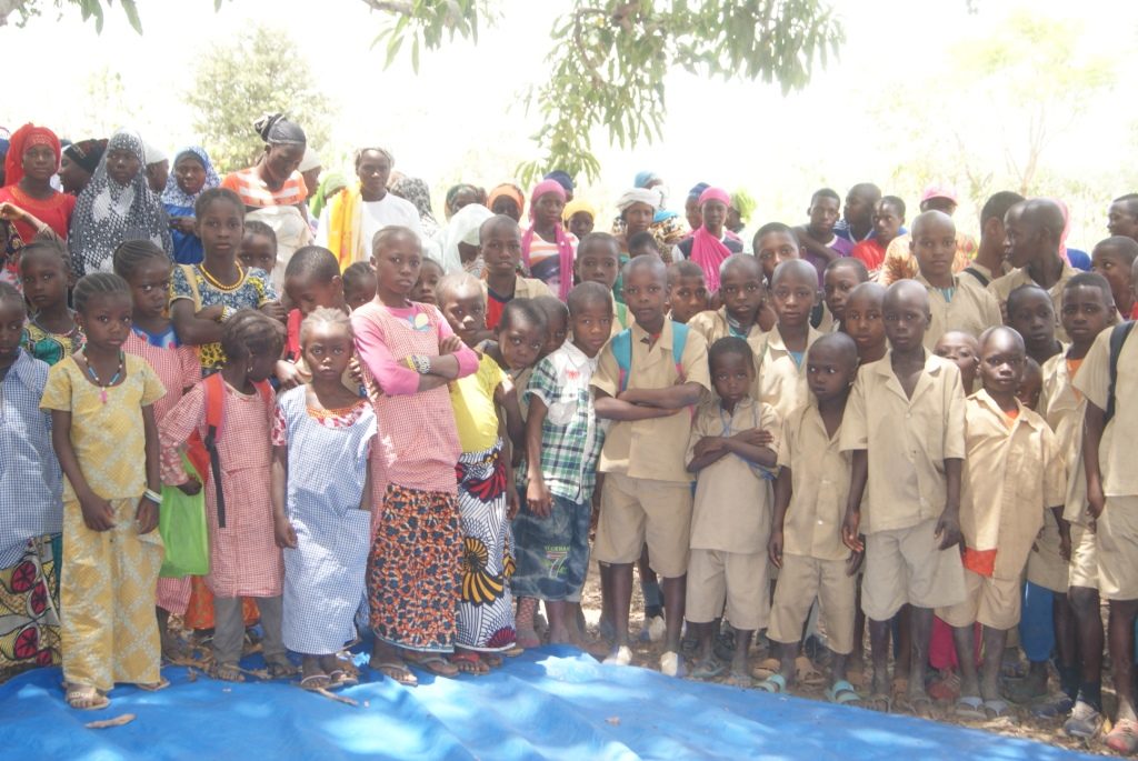 Eleves et parents déleves se trouvants sous un arbre derriere la cour de lécole de Tondon