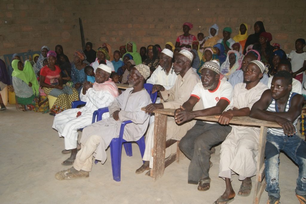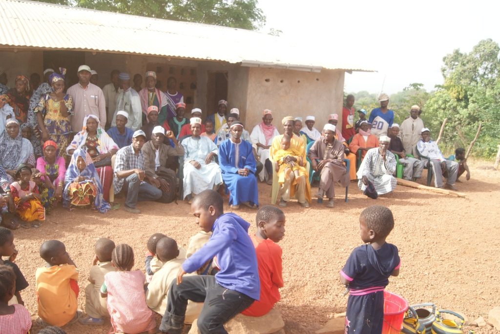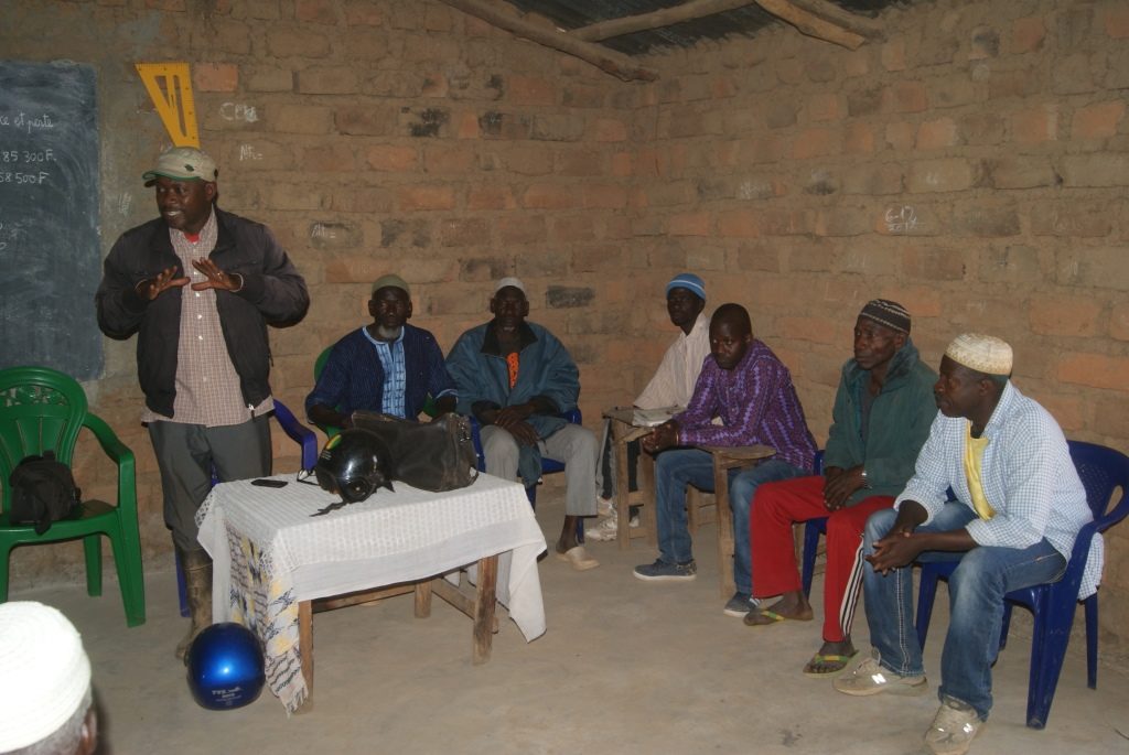 Mr Sidibé en entretient avec des représentant de la Jeunesse et des sages de Daroun-Salam dans la salle de classe