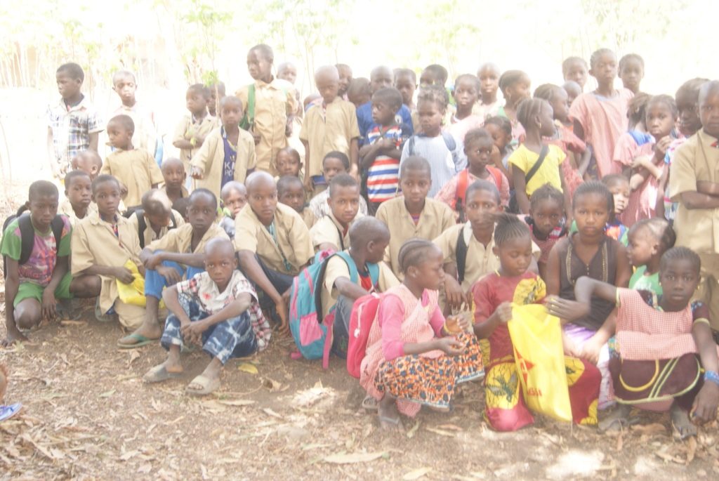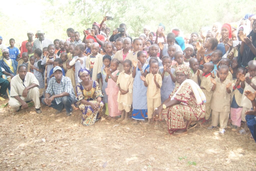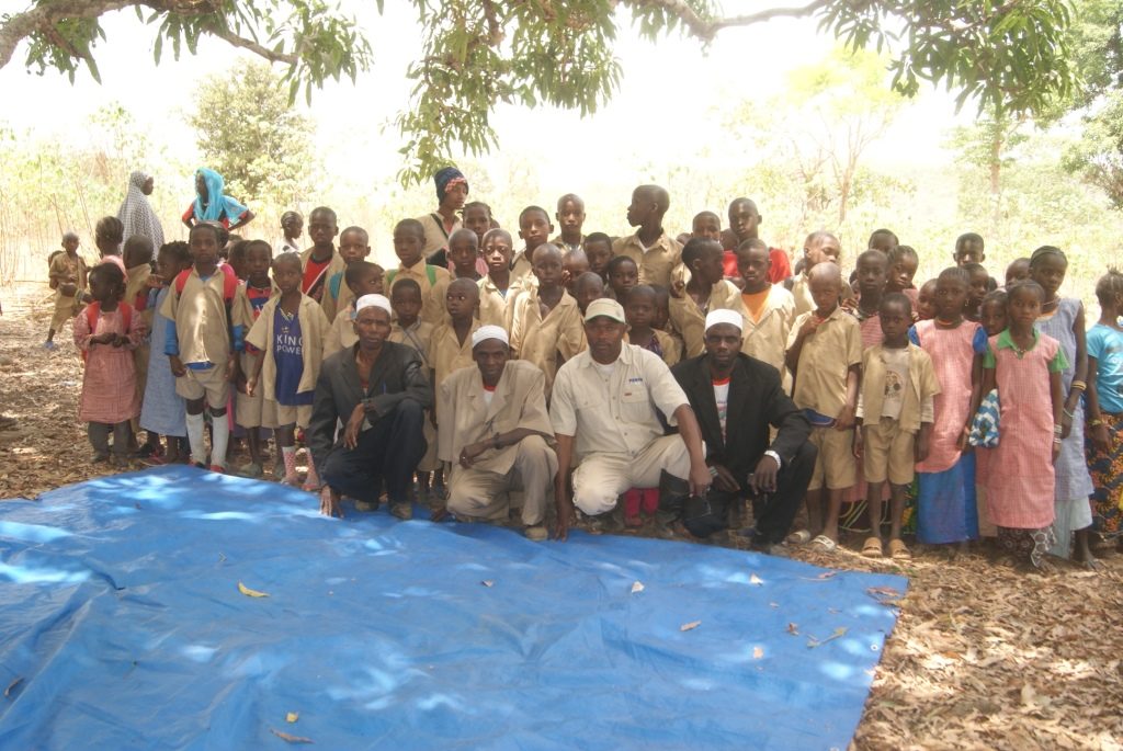 Mme Mariama Korka Diallo lenseignante de Benguérin assise au milieu 3 membres de lAPEAE et les éleves de Benguérin