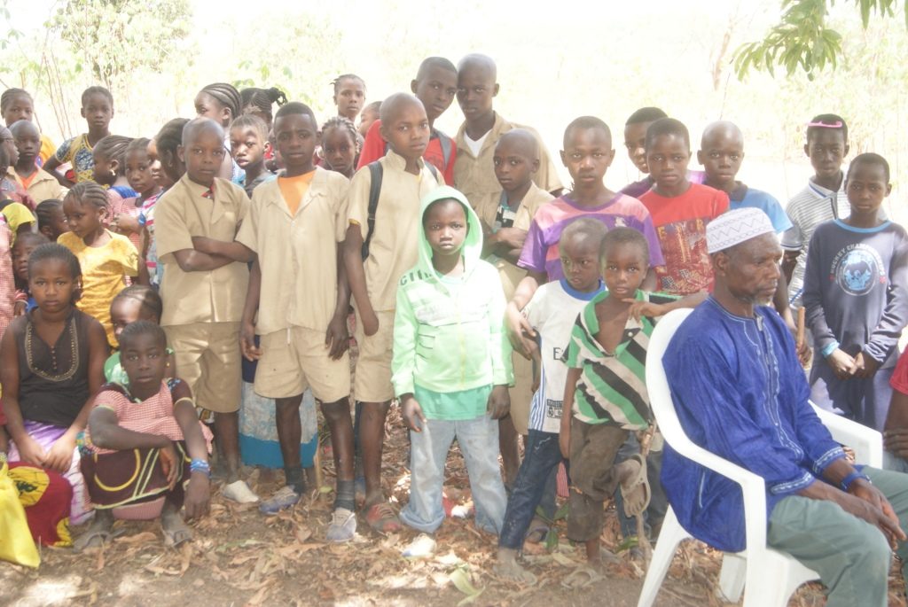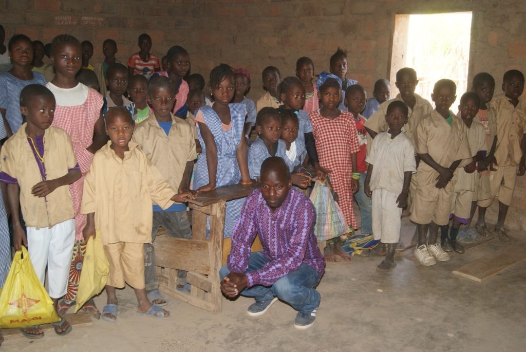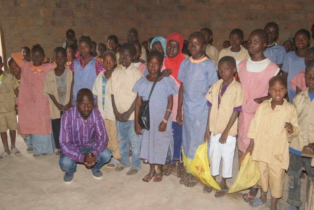 Mr Daouda Sylla en tissort orange des membres de LAPEAE et les éleves dans la classe de Tondon
